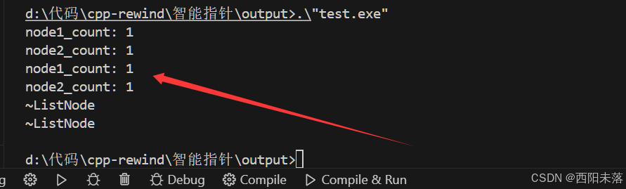因为我们的这两个节点最终的计数都是1,没有到0,所以它们的析构函数永远不会被调用,堆上的内存也就不会被释放了,这也就导致了我们的内存泄露。