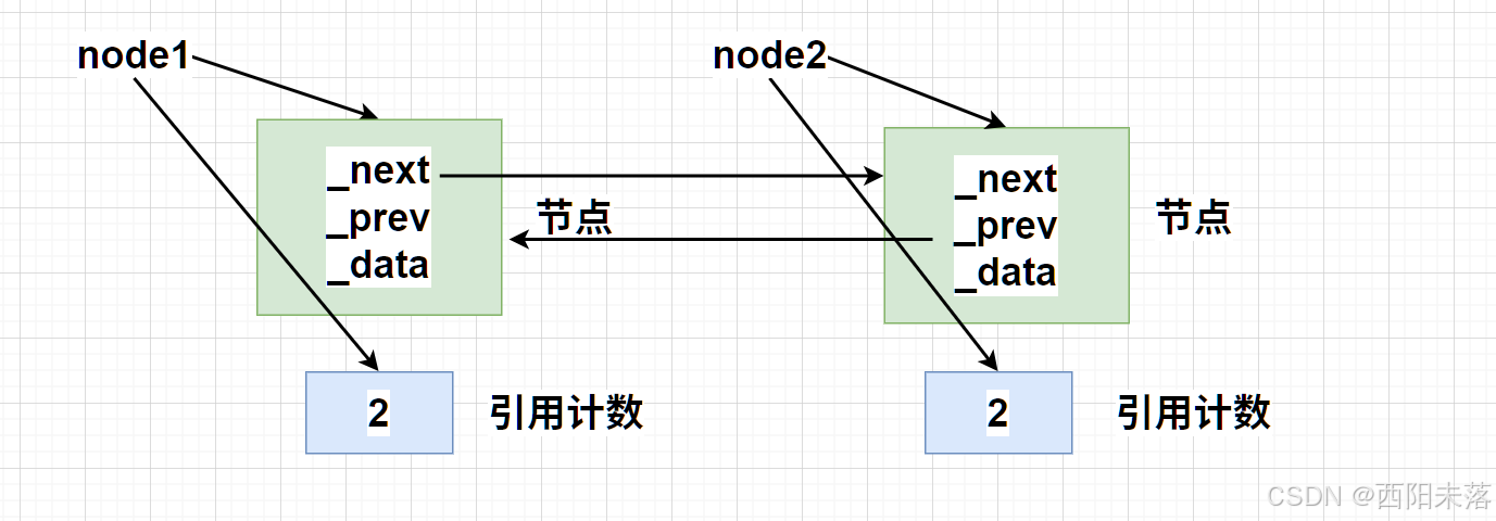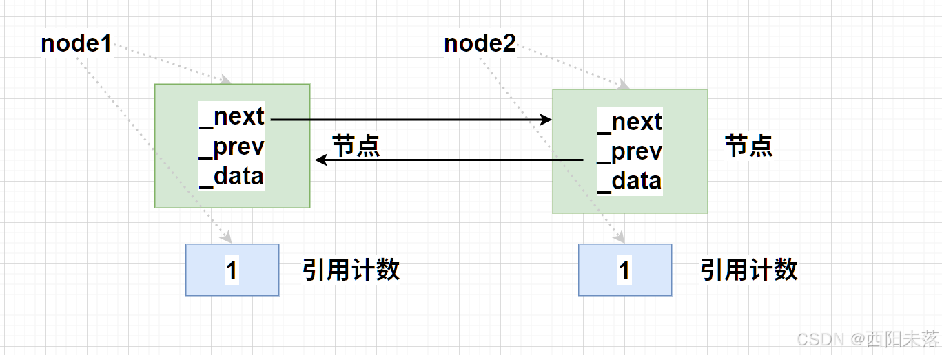 3、node2->_prev = node1;==>node1的引用计数增加到了2(被main里面的node1和node2->_prev持有)。