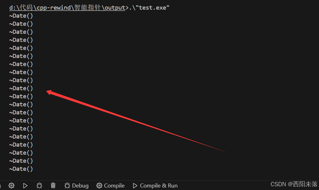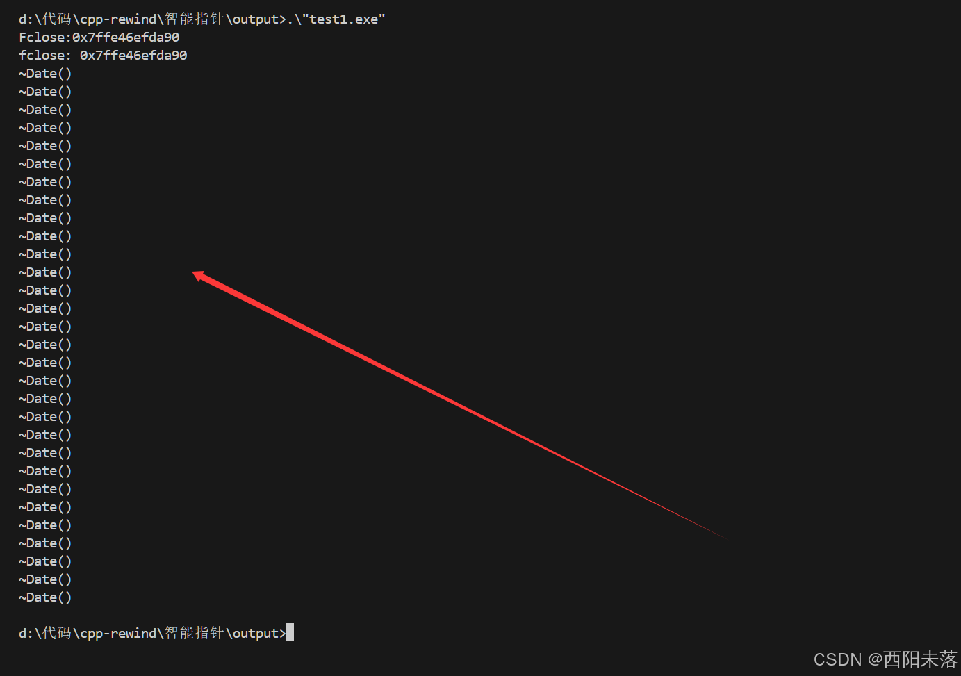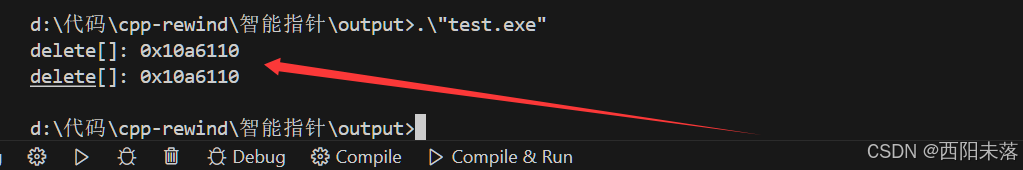 };int main() {// ----------------------------------------------------// 1. 函数对象 (Functor) 作为删除器,仿函数// ----------------------------------------------------std::unique_ptr<Date, DeleteArray<Date>> up2(new Date[5], DeleteArray<Date>());std::shared_ptr<Date> sp2(new Date[5], DeleteArray<Date>());// ----------------------------------------------------// 2. 函数指针 (Function Pointer) 作为删除器// ----------------------------------------------------std::unique_ptr<Date, void(*)(Date*)> up3(new Date[5], DeleteArrayFunc<Date>);std::shared_ptr<Date> sp3(new Date[5], DeleteArrayFunc<Date>);// ----------------------------------------------------// 3. Lambda 表达式 作为删除器// ----------------------------------------------------auto delArrOBJ = [](Date* ptr) { delete[] ptr; };std::unique_ptr<Date, decltype(delArrOBJ)> up4(new Date[5], delArrOBJ);std::shared_ptr<Date> sp4(new Date[5], delArrOBJ);// ----------------------------------------------------// 4. 实现其他资源管理的删除器// ----------------------------------------------------FILE* file_a = fopen("Test.cpp", "r");if (file_a) {std::shared_ptr<FILE> sp5(file_a, Fclose());}FILE* file_b = fopen("Test.cpp", "r");if (file_b) {std::shared_ptr<FILE> sp6(file_b, [](FILE* ptr) {std::cout << "fclose: " << ptr << std::endl;if (ptr) fclose(ptr);});}return 0;