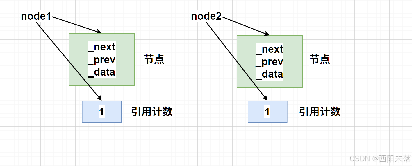 int main() {shared_ptr<ListNode> node1(new ListNode);shared_ptr<ListNode> node2(new ListNode);cout << "node1_count: " << node1.use_count() << endl;cout << "node2_count: " << node2.use_count() << endl;node1->_next = node2;node2->_prev = node1;cout << "node1_count: " << node1.use_count() << endl;cout << "node2_count: " << node2.use_count() << endl;return 0;