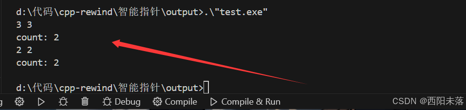int main() {shared_ptr<int> sp1(new int(1));shared_ptr<int> sp2(sp1);*sp1 = 2;*sp2 = 3;cout << *sp1 << " " << *sp2 << endl;cout << "count: " << sp1.use_count() << endl; // 引用计数shared_ptr<int> sp3(new int(1));shared_ptr<int> sp4(new int(2));sp3 = sp4;cout << *sp3 << " " << *sp4 << endl;cout << "count: " << sp3.use_count() << endl; // 引用计数return 0;