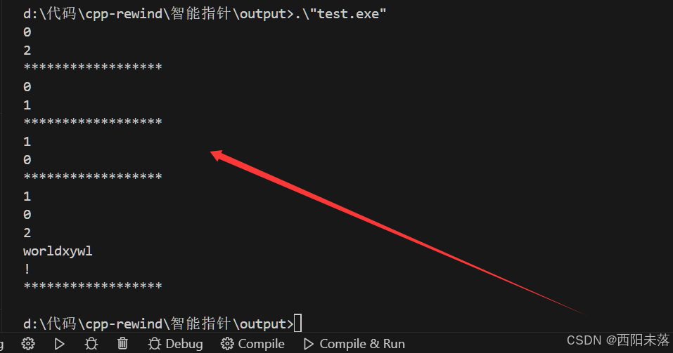 using namespace std;int main() {shared_ptr<string> sp1(new string("hello"));shared_ptr<string> sp2(sp1);weak_ptr<string> wp = sp1;cout << wp.expired() << endl;cout << wp.use_count() << endl;cout << "******************" << endl;// 这里sp1和sp2都指向了其他的资源,也就表示我们的weak_ptr过期了sp1 = make_shared<string>("world");cout << wp.expired() << endl;cout << wp.use_count() << endl;cout << "******************" << endl;sp2 = make_shared<string>("!");cout << wp.expired() << endl;cout << wp.use_count() << endl;cout << "******************" << endl;wp = sp1;cout << wp.use_count() << endl;auto sp3 = wp.lock();cout << wp.expired() << endl;cout << wp.use_count() << endl;*sp3 += "xywl";cout << *sp1 << endl;cout << *sp2 << endl;cout << "******************" << endl;return 0;