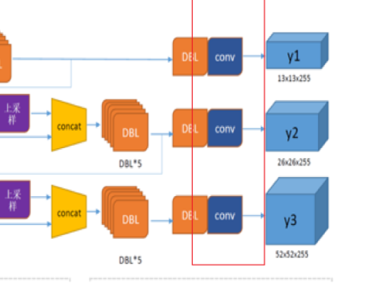 上采样 → 无DBL 1个DBL(上采样后的卷积) → 1个DBL Concat操作 → 无DBL 6个DBL → 6个DBL 输出卷积层(无BN/LeakyReLU) → 0个DBL(上图红色实线框)