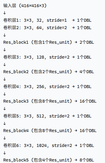 根据上述计算流程,网络首先通过一个3×3的卷积层(DBL结构),该卷积层包含32个通道,步长为1。接着进入Res1模块,其中包含一个零填充层(Zero Padding)。完成填充后,网络通过第二个卷积层,该层采用3×3卷积核、64个通道和步长2的设置。随后进入Res Unit模块,该模块包含两个DBL层(如先前分析所示)和一个加法操作。