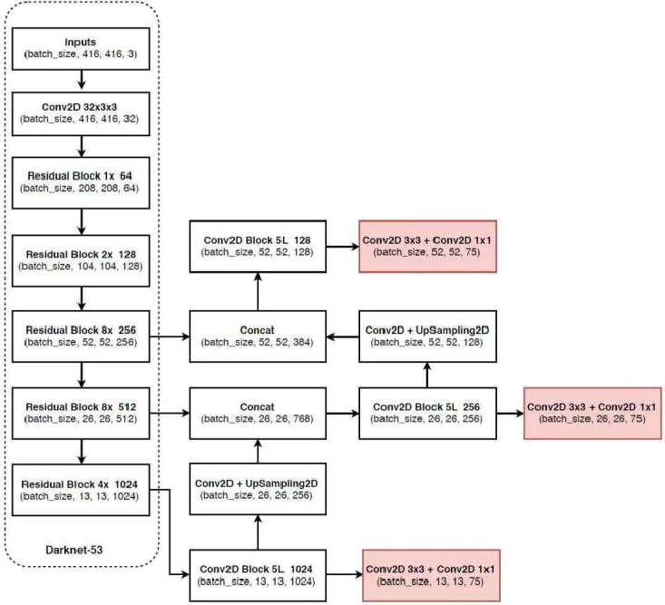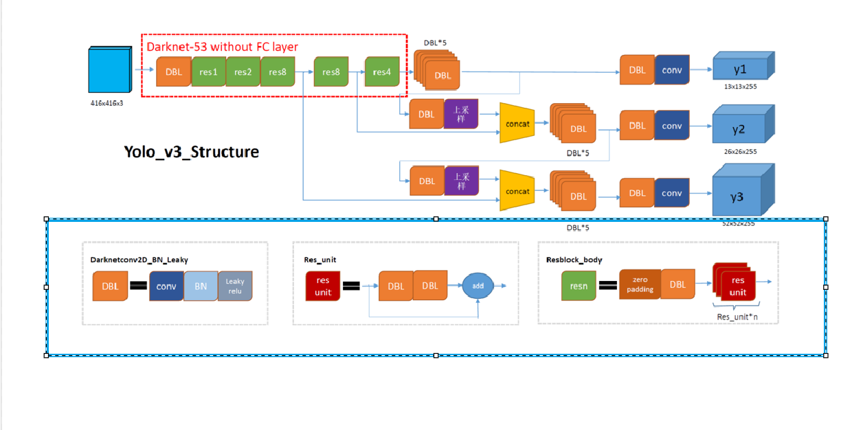 YOLOv3的整体网络结构(Yolo_body)包含252层:这些层分别为: