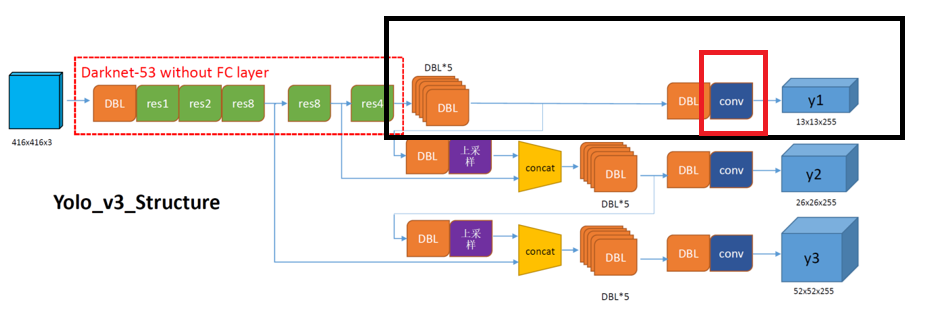 6个DBL → 6个DBL(如图黑色框里面) 输出卷积层(红色实线框)(无BN/LeakyReLU) → 0个DBL