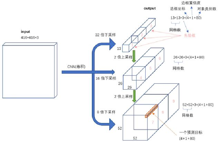 所以,一个网格细胞预测 3 个 box,本质上就是让这个细胞有机会检测到 3 种不同形状(由该尺度的 3 个锚框定义)的物体。
