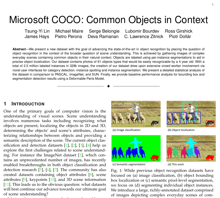 COCO 数据集 因其规模大、标注质量高、任务多样而成为计算机视觉领域的事实标准基准。它极大地推动了目标检测、分割等相关领域的发展,几乎所有最先进的模型都会在 COCO 数据集上报告其性能以进行比较。对于任何从事相关领域研究和应用的人来说,熟悉和使用 COCO 数据集都是必不可少的