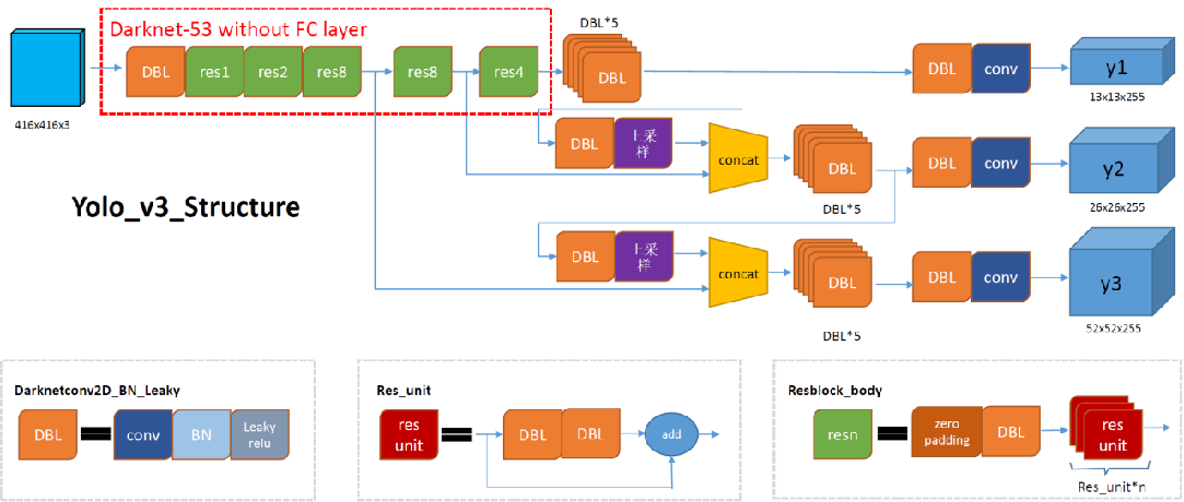 resblock_body(也就是图中的res n (res 1, res 2......)) :zero-padding+DBL +n个ResUnit