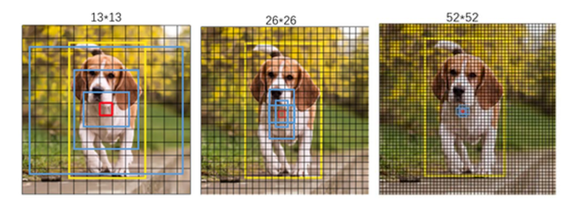 如图所示,在检测较大目标如一只狗时,我们可以使用13×13的检测框来完整框住目标。但对于图中更细小的物体,由于目标尺寸可能小于13×13的检测框,此时就需要采用更精确的52×52检测框来进行识别和定位。