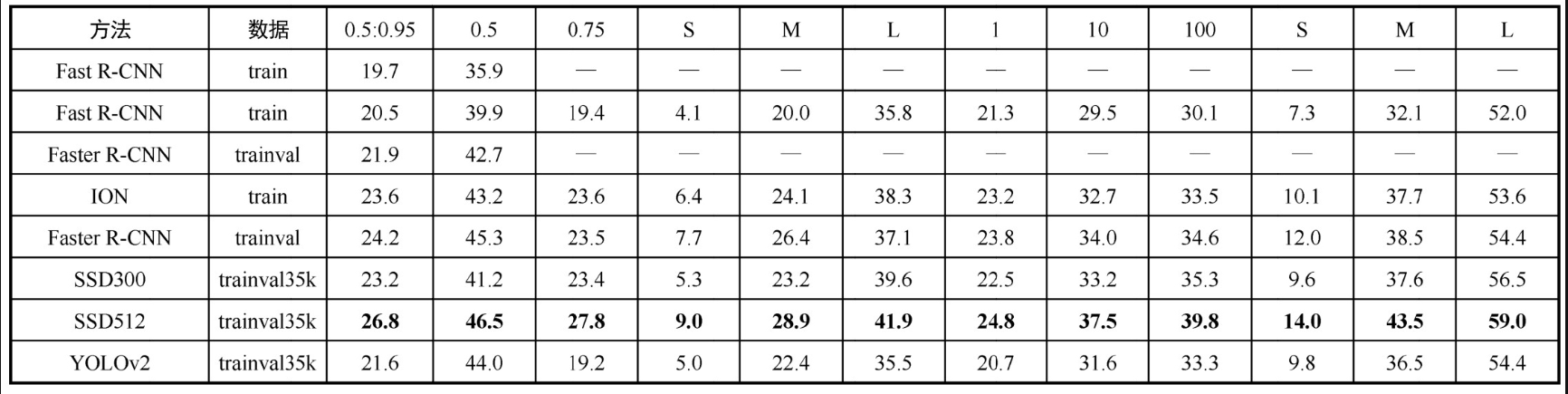 SSD | VGG-16 | 中等 | 极快 (最高) | 速度极快,单阶段检测器先锋。 | 最快但精度一般 |