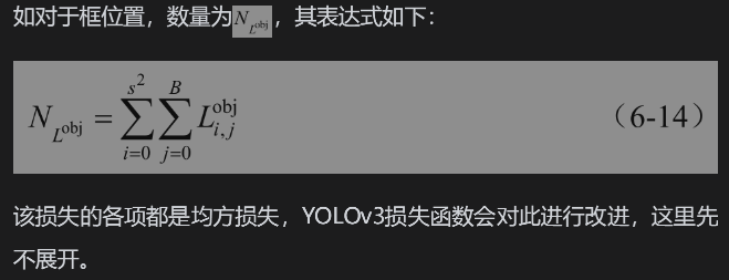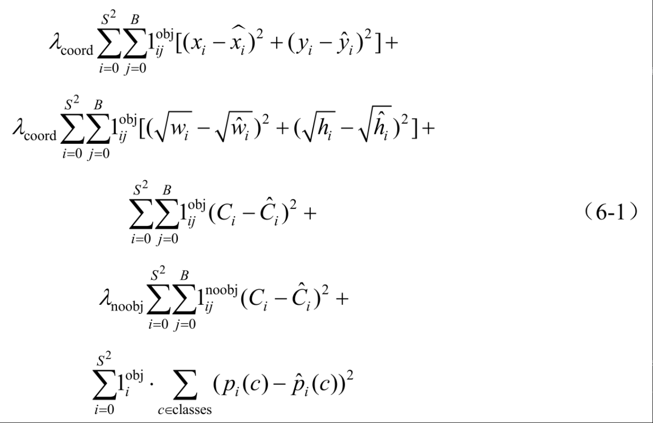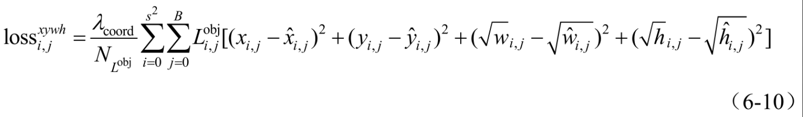 (1)第1项:位置损失负责预测目标的锚框的坐标损失,包括中心定位和边界定位。对其进行展开来观察细节,如式(6-10)所示,YOLOv1中的边界定位采用根号后的差值的平方。