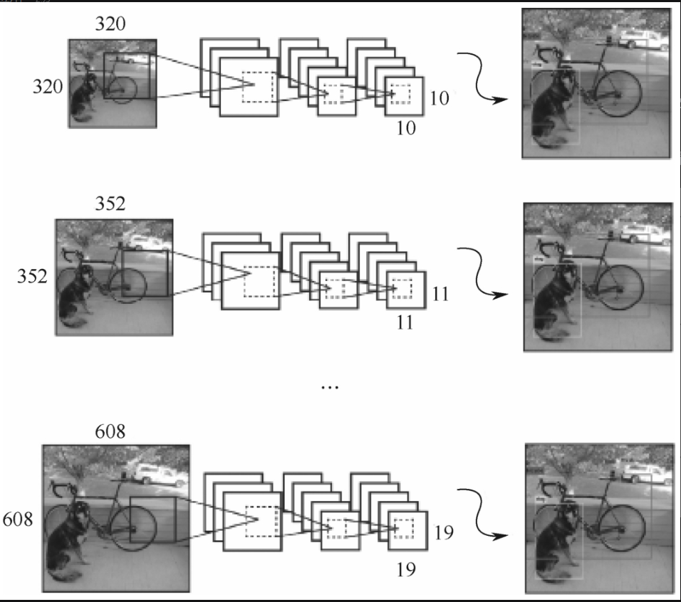 这样,以单元格作为图像“细胞”,相当于对图像进行一次遍历,然后在每个遍历位置(单元格)检测可能的对象,为了确定对象大小,又设置不同的边界框,考虑可能的不同形状,这样,以非常利索的方式解决R-CNN中的选择搜索或RPN问题。