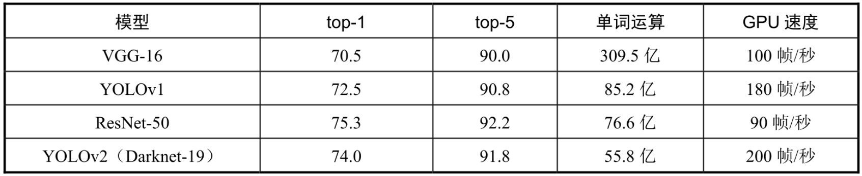 可以看出YOLOv2的top-1准确率是74%,top-5准确率是91.8%。所谓top-1准确率,是指排名第一的类别与实际结果相符的准确率,而top-5准确率是指排名前五的类别包含实际结果的准确率。单次运行次数为55.8亿次,运行速度是每秒200帧,准确率也比YOLOv1有所提高,虽然比ResNet-50稍微低些,但是速度是ResNet-50的2倍。YOLOv2很好地兼顾了准确率和速度。