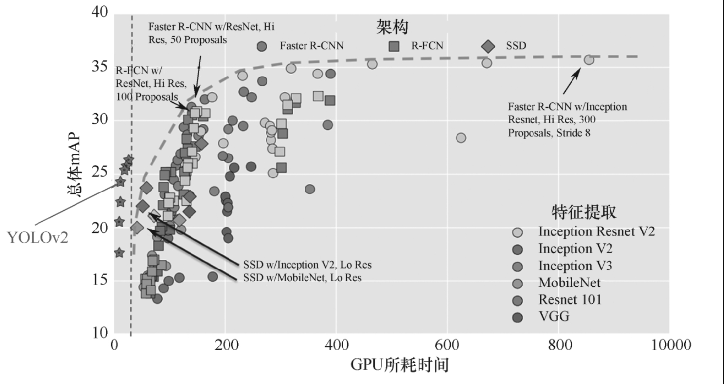 图6-6-5所示为YOLOv2与其他方法的速度对比,横坐标为GPU所耗时间(GPU Time),纵坐标为总体mAP(Overall mAP)。