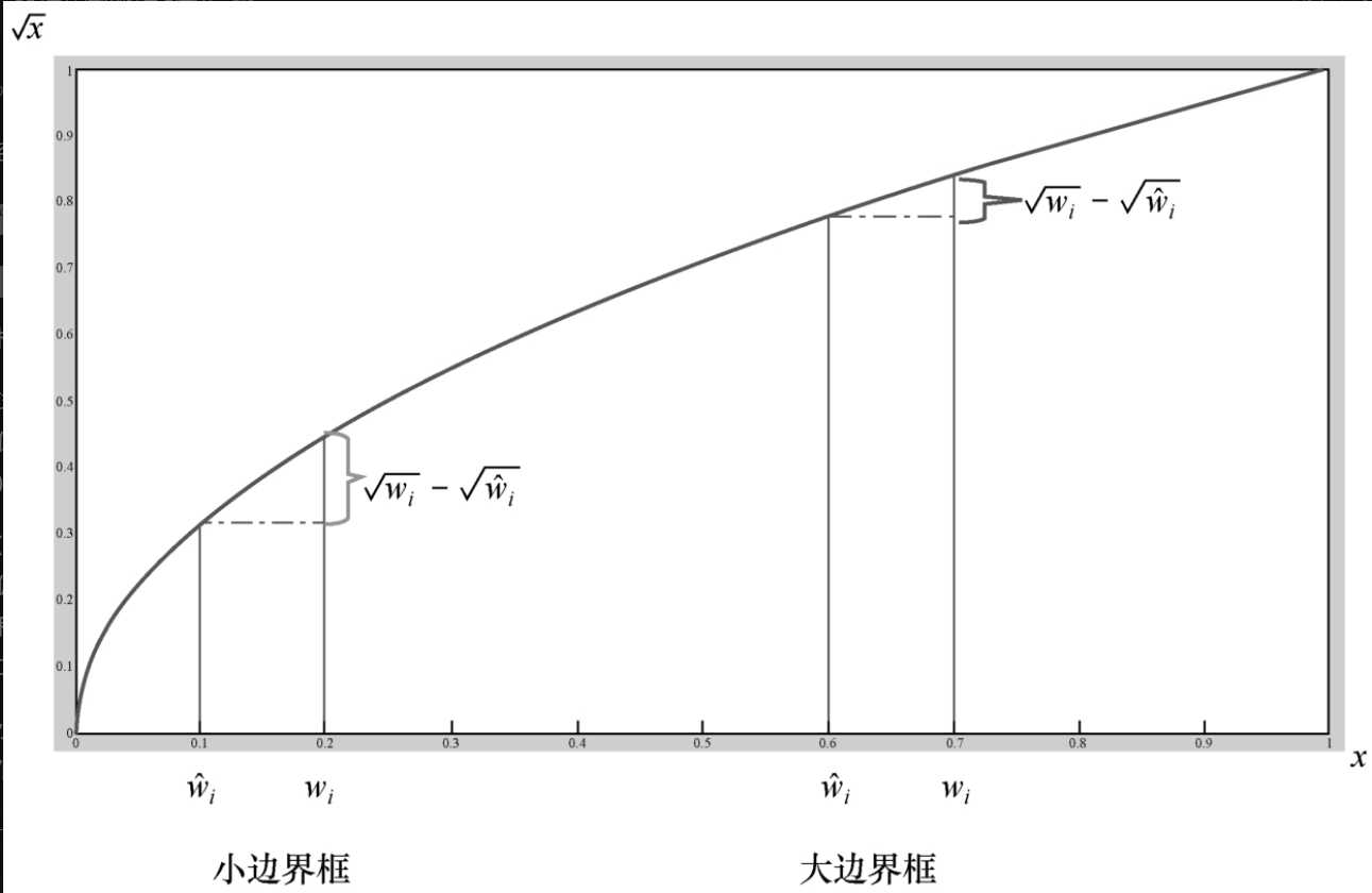 位置损失 (宽高) | 负责预测的锚框 | 惩罚预测框宽高(w, h)与真实框的偏差。为减小大框的绝对误差影响,对宽高取平方根。 | λ_coord * Σ [ (√w_i - √w_hat_i)² + (√h_i - √h_hat_i)² ] | 只对“责任人”框计算。取平方根使损失更均衡。 |