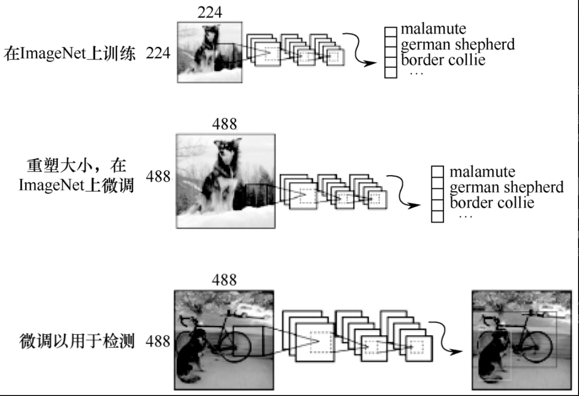 YOLOv2的训练主要包括3个阶段,前两个阶段是分类训练,最后一个阶段是检测训练,如图6-6-1所示。