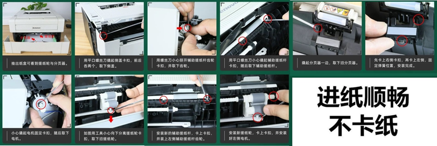 没办法了,经过仔细的观察,每次卡纸的时候,发觉二进轮有点打滑,怎么观察到的呢?我拆下了这台联想M7400黑白激光打印机的侧盖,观察进纸轮上齿轮的转动变化发现的,于是将错纸轮、分页器、二进轮(辅助轮、辅助搓纸杆)这三个小配件全部更换了,更换之后测试一切正常,不再卡纸了;