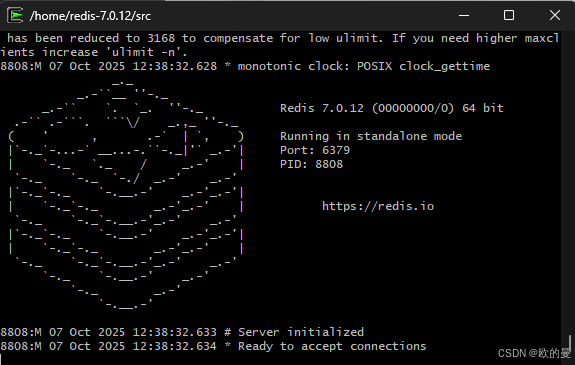 # 前台启动 Redis(终端会持续显示服务日志,不要关闭终端)