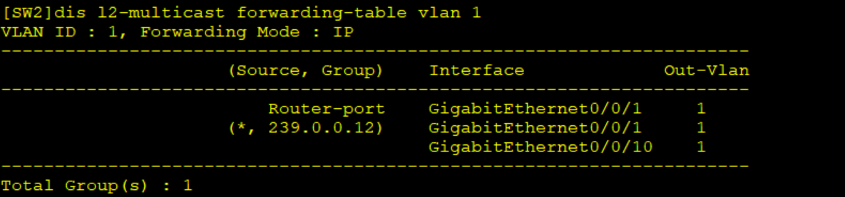 [SW2-GigabitEthernet0/0/10]l2-multicast static-group group-address 239.0.0.12 vlan 1
