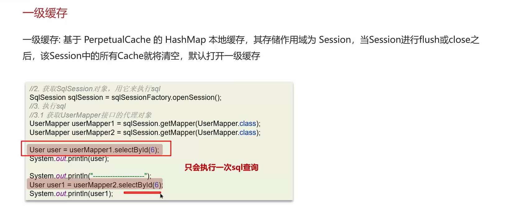 中执行两次相同的SQL查询(相同的SQL和参数),第一次会查询数据库并将结果放入缓存,第二次则直接从缓存中获取,不再访问数据库。 - 它内部是一个简单的