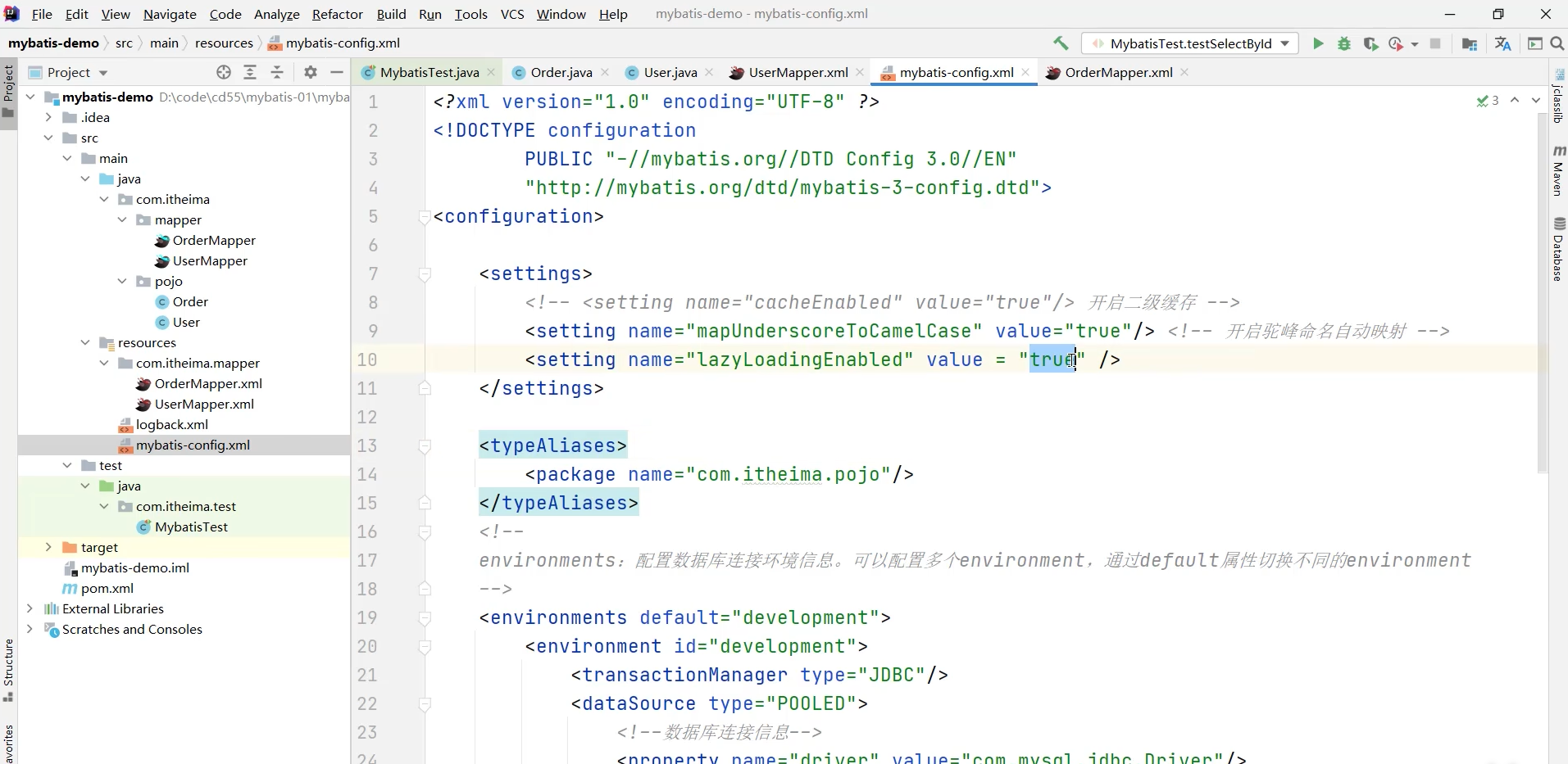 <settings><!-- 开启延迟加载 --><setting name="lazyLoadingEnabled" value="true"/><!-- 禁止 aggressive lazy loading(按需加载) --><setting name="aggressiveLazyLoading" value="false"/></settings>