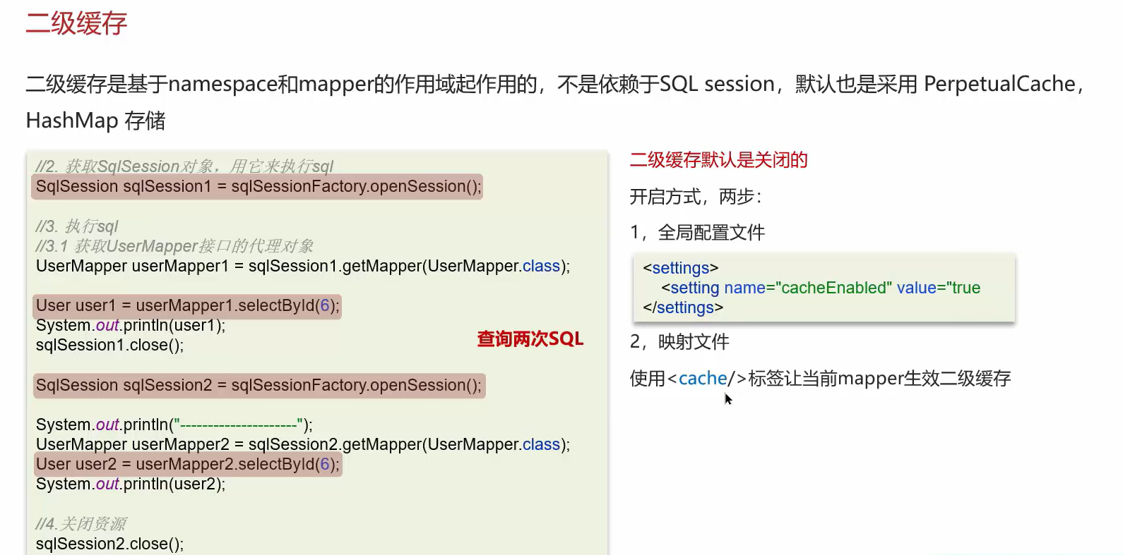 - 作用范围:SqlSession级别。默认开启,无法关闭。