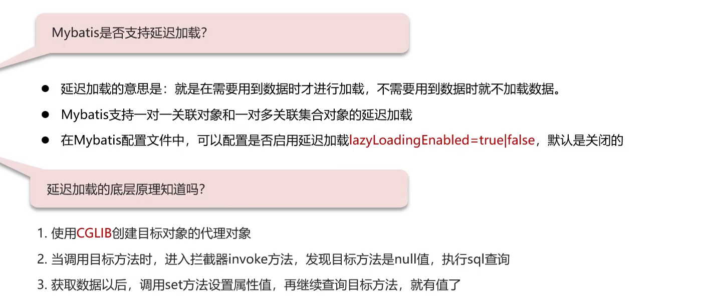 * `lazyLoadingEnabled`:延迟加载的全局开关。 * `aggressiveLazyLoading`:如果设置为 `true`,任何方法的调用都会加载所有延迟加载属性。设置为 `false` 则表示每个属性按需加载。