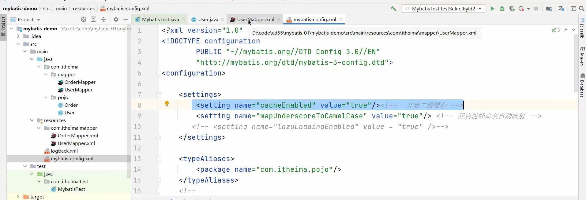 <settings><setting name="cacheEnabled" value="true"/> <!-- 默认为true,通常不用改 --></settings>