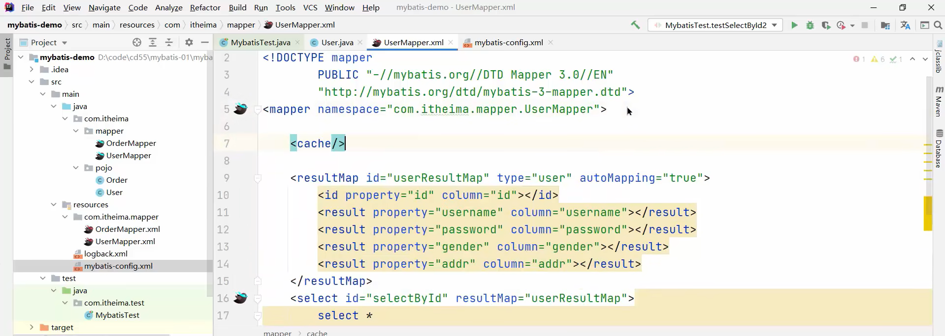 <?xml version="1.0" encoding="UTF-8" ?><!DOCTYPE mapper PUBLIC "-//mybatis.org//DTD Mapper 3.0//EN" "http://mybatis.org/dtd/mybatis-3-mapper.dtd"><mapper namespace="com.example.mapper.UserMapper"><cache/> <!-- 启用二级缓存 -->...</mapper>