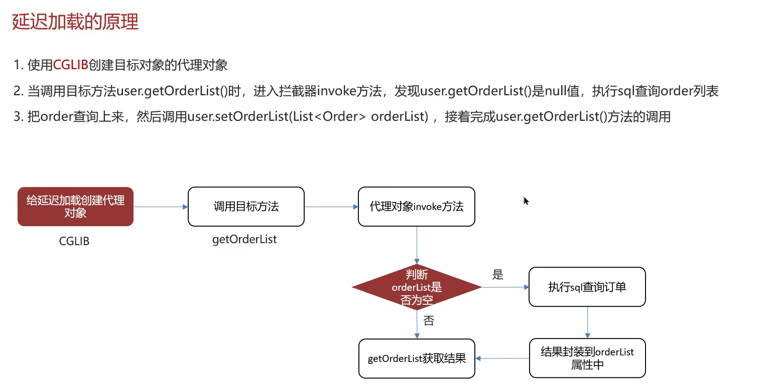 的代理)。 - 拦截方法调用:这个代理对象实现了所有的目标对象方法,并持有一个用于执行延迟加载SQL的