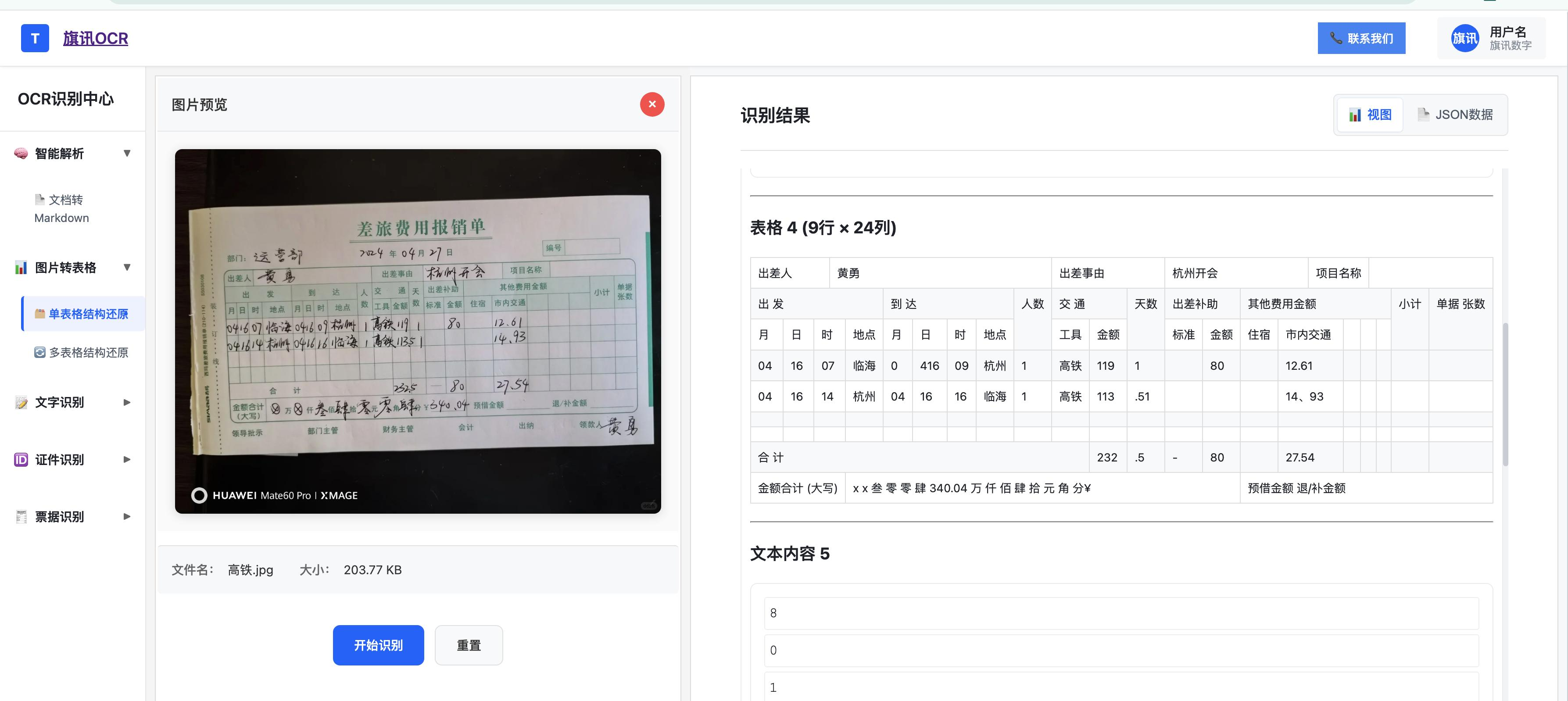 旗讯 OCR 基于 “深度学习模型 + 工程化适配” 架构,针对报销场景做了专项优化,可直接降低开发难度与集成成本: