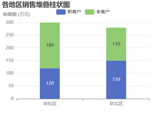 “生成各地区销售堆叠柱状图: 华东区:新客户120万,老客户180万 华北区:新客户150万,老客户130万 添加新客户平均值参考线,显示数据标签”