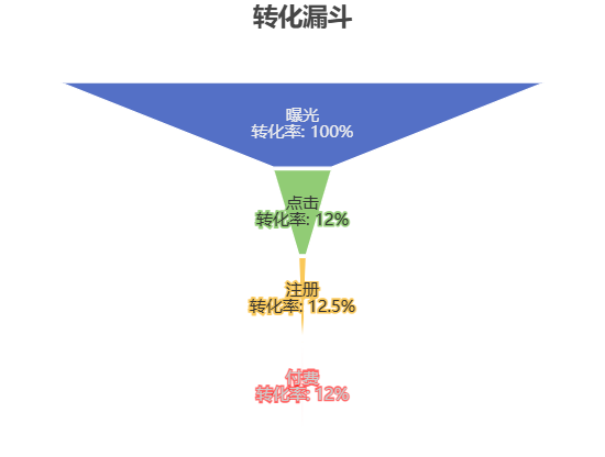 “创建转化漏斗: 曝光10万→点击1.2万→注册1500→付费180 标注各环节转化率,高亮注册到付费阶段”