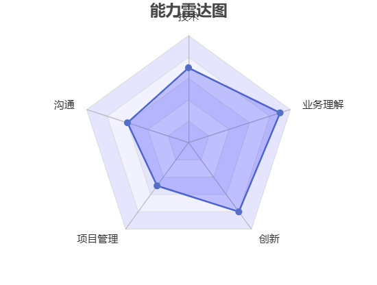 “绘制能力雷达图: 技术7分、沟通6分、项目管理5分、创新8分、业务理解9分 填充半透明蓝色,在业务理解顶点标注‘优势’”