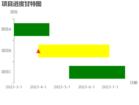 “绘制项目进度甘特图: 项目A:3月1日-4月15日,进度90% 项目B:4月1日-6月30日,进度40% 项目C:5月10日-7月20日,进度10% 用绿色表示正常进度,黄色高亮项目B并添加风险标识”