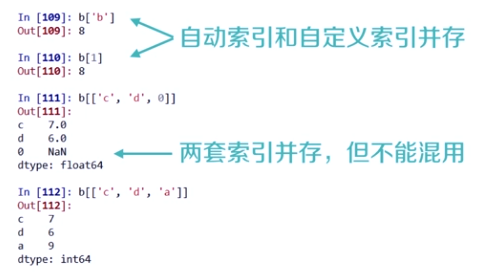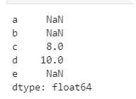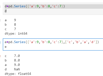 d=pd.Series({'a':9,'b':8,'c':7}) #注意这里一定要有大括号 d e=pd.Series({'a':9,'b':8,'c':7},['c','b','a','d']) e
