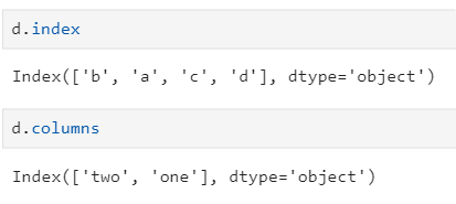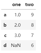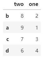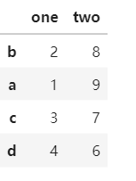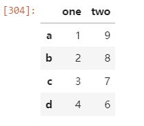 import pandas as pd dl={'one':[1,2,3,4],'two':[9,8,7,6]} d=pd.DataFrame(dl,index=['a','b','c','d']) d