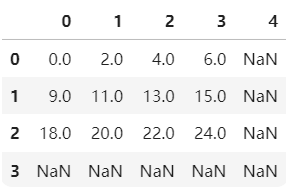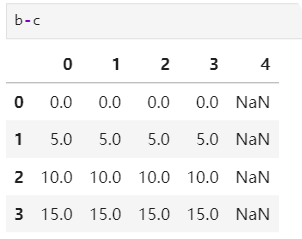 a=pd.DataFrame(np.arange(12).reshape(3,4)) a b=pd.DataFrame(np.arange(20).reshape(4,5)) b a+b