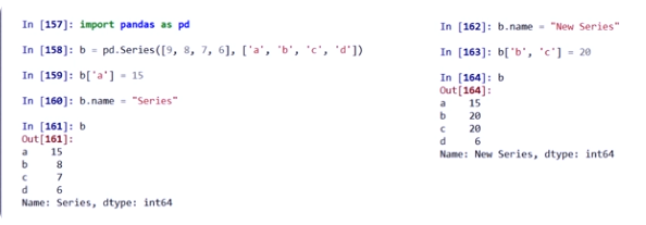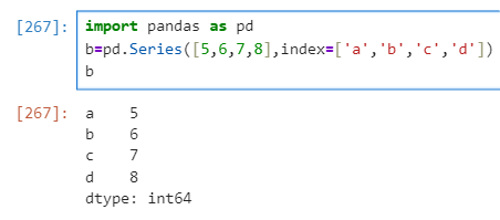 import pandas as pd b=pd.Series([5,6,7,8],index=['a','b','c','d']) b