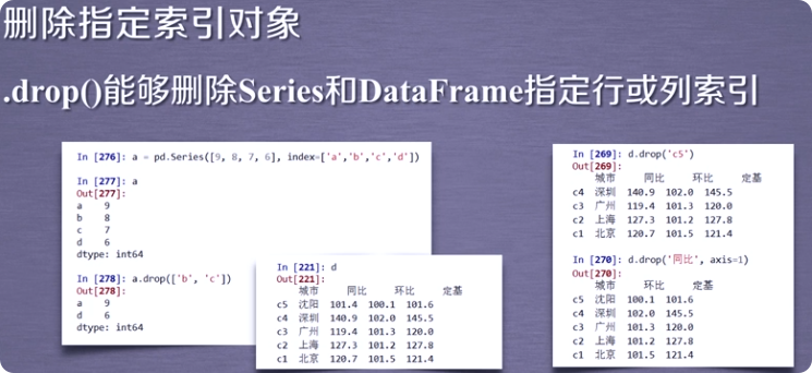 可以发现上面的delete()也可以用来删除,两者有何不同?delete主要用于Index对象和Series对象,按位置(系统默认的从0开始的非自定义整数索引)删除元素,drop主要用于DataFrame和Series,按标签(自定义索引值)删除行或列。但我们发现上面DataFrame也用了delete,如果要按位置删除DataFrame的行或列,可以先使用iloc或index/columns属性来获取位置对应的标签,才能进行删除。