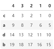 import pandas as pd import numpy as np b=pd.DataFrame(np.arange(20).reshape(4,5),index=['c','a','d','b']) bb.sort_index() #纵轴升序 b.sort_index(ascending=False) #纵轴索引降序 b.sort_index(axis=1,ascending=False) #横轴索引升序 b.sort_index(axis=1,ascending=True) #横轴索引降序