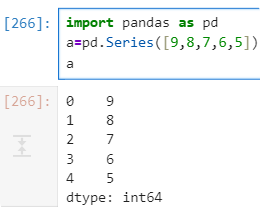 import pandas as pd a=pd.Series([9,8,7,6,5]) a