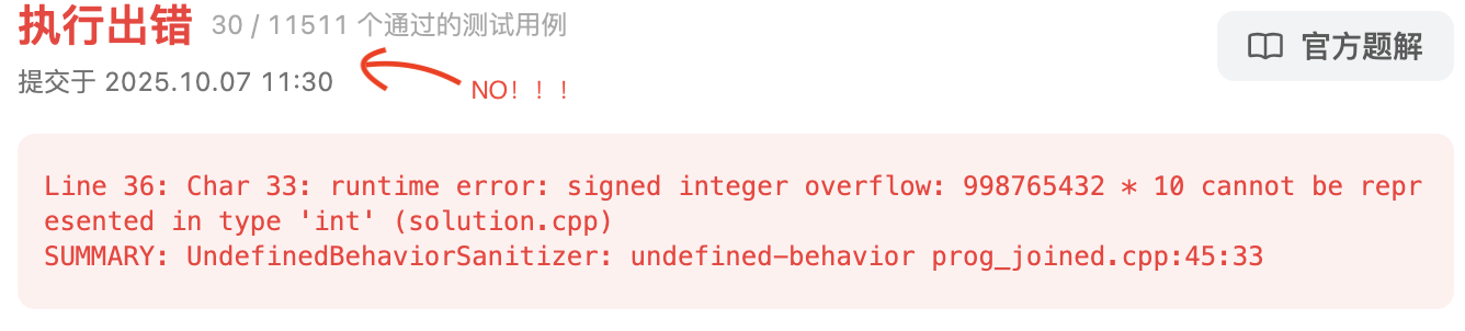 public:bool isPalindrome(int x) {if (x < 0) return false; // 负数肯定不是回文if (x < 10) return true; // 个位数肯定是回文if (x % 10 == 0) return false; // 以0结尾的不是回文int reversed = 0; // 存储反转的后半部分while (x > reversed) { // 当原数大于反转数时继续reversed = reversed * 10 + x % 10; // 反转数字x /= 10; // 原数去掉最后一位}// 偶数位:x == reversed// 奇数位:x == reversed/10 (去掉中间那位)return x == reversed || x == reversed / 10;}