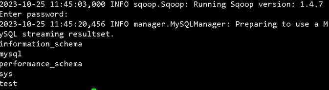 sqoop list-databases --connect jdbc:mysql://localhost:3306/?allowPublicKeyRetrieval=true --username root --password yourPassword1234!