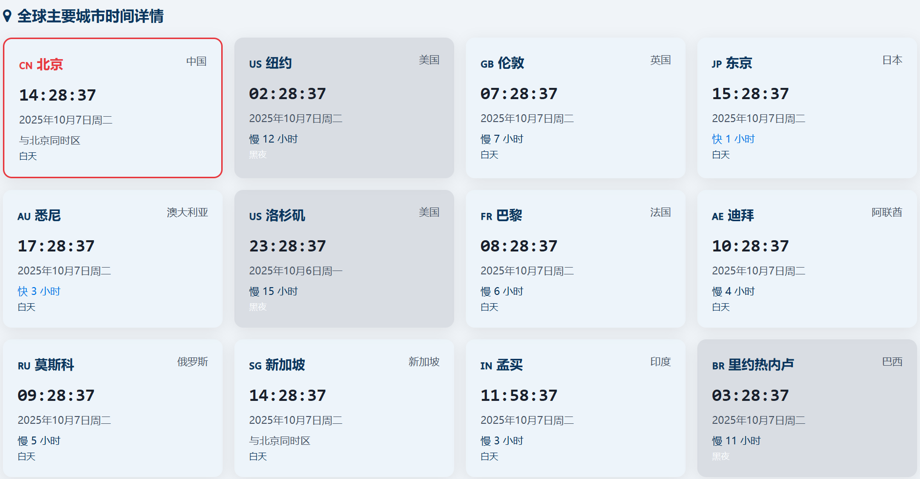 全球主要城市时间对比,实时更新|昼夜区分|时间对比