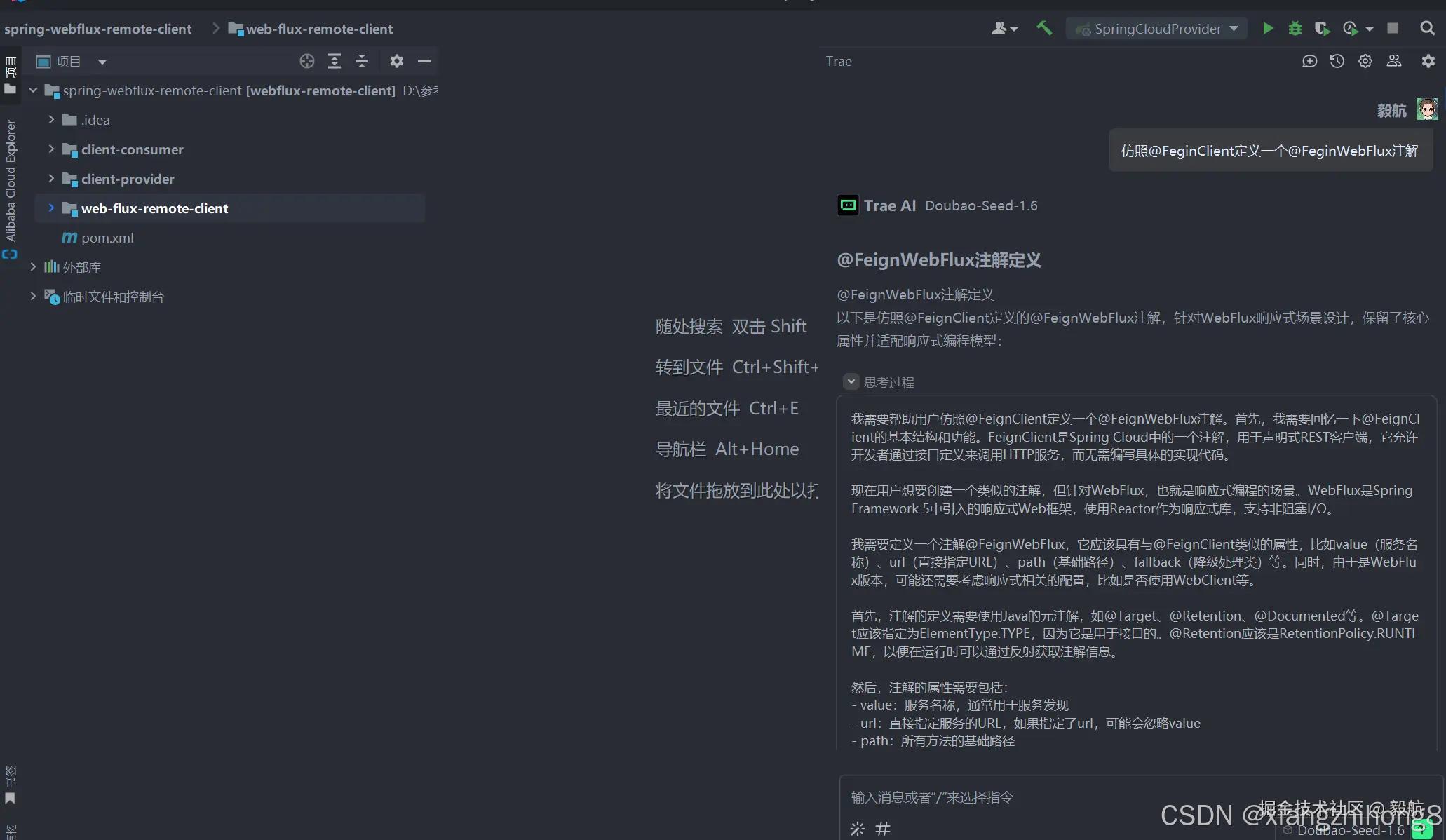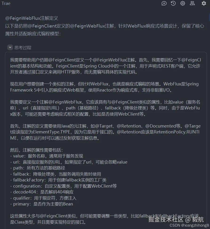 依据我们之前描述,我们首先需要定义一个@FeignWebFlux的注解,此处我们借助Trae来实现。