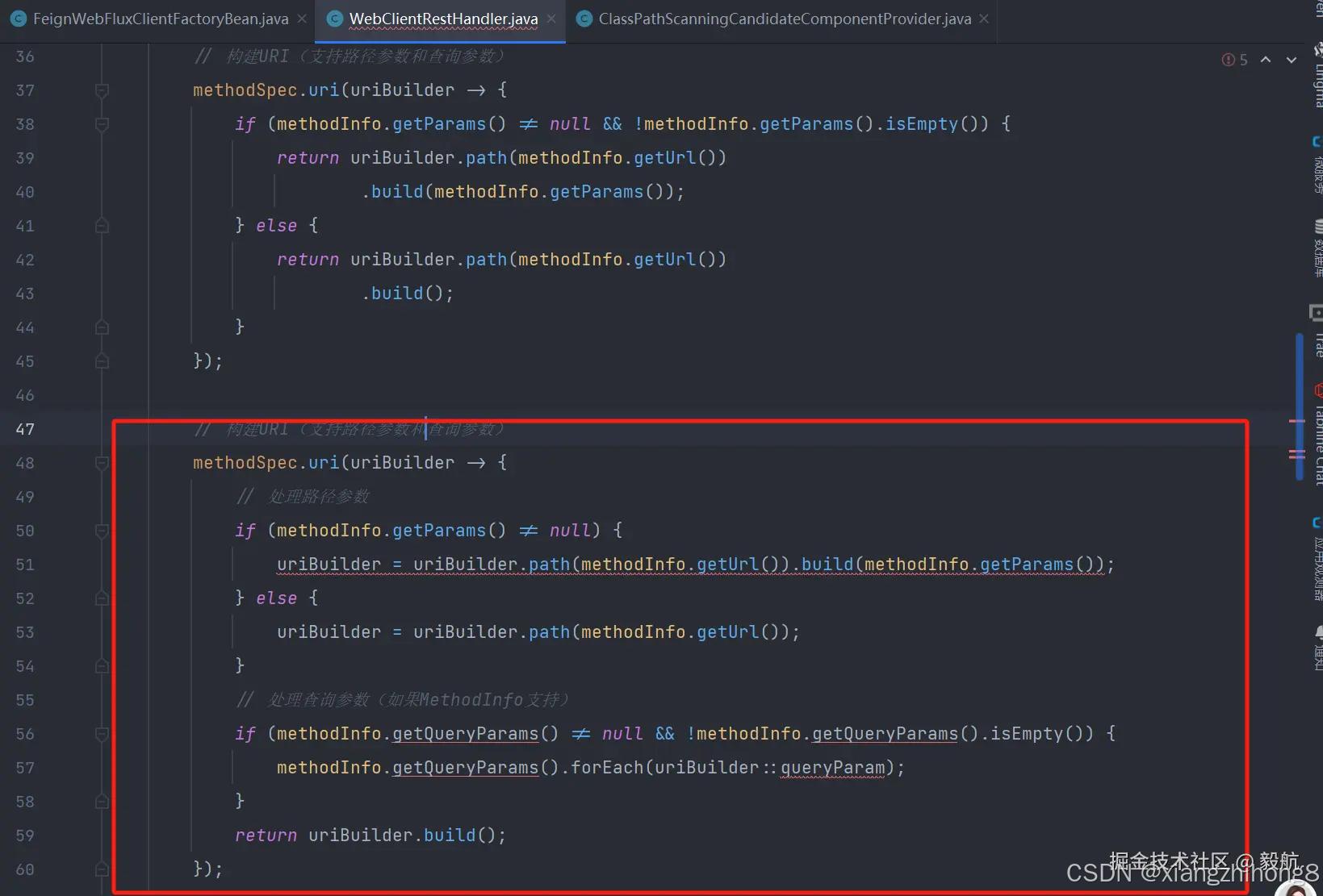 public class FeignWebFluxRegistrar implements ImportBeanDefinitionRegistrar, EnvironmentAware{private Environment environment;@Overridepublic void registerBeanDefinitions(AnnotationMetadata importingClassMetadata, BeanDefinitionRegistry registry) {// 1. 获取@EnableFeignWevFluxClients(扫描路径)String[] basePackages = (String[]) importingClassMetadata.getAnnotationAttributes(EnableFeignWevFluxClients.class.getName()).get("basePackages");if (basePackages.length == 0) {// 默认扫描启动类所在包String defaultPackage = ClassUtils.getPackageName(importingClassMetadata.getClassName());basePackages = new String[]{defaultPackage};}// 2. 扫描指定包下所有标注@WebFluxClient的接口ClassPathScanningCandidateComponentProvider scanner = this.getScanner();scanner.addIncludeFilter(new AnnotationTypeFilter(FeignWebFlux.class)); // 只扫描带@WebFluxClient的接口for (String basePackage : basePackages) {Set<BeanDefinition> candidateComponents = scanner.findCandidateComponents(basePackage);for (BeanDefinition beanDefinition : candidateComponents) {if (beanDefinition instanceof AnnotatedBeanDefinition) {AnnotatedBeanDefinition annotatedBeanDefinition = (AnnotatedBeanDefinition) beanDefinition;AnnotationMetadata metadata = annotatedBeanDefinition.getMetadata();// 只处理接口if (metadata.isInterface()) {registerFeignClient(registry, metadata);}}}}}protected ClassPathScanningCandidateComponentProvider getScanner() {return new ClassPathScanningCandidateComponentProvider(false, this.environment) {@Overrideprotected boolean isCandidateComponent(AnnotatedBeanDefinition beanDefinition) {boolean isCandidate = false;if (beanDefinition.getMetadata().isIndependent() && !beanDefinition.getMetadata().isAnnotation()) {isCandidate = true;}return isCandidate;}};}// 注册FeignWebFlxu客户端(通过工厂Bean生成代理)private void registerFeignClient(BeanDefinitionRegistry registry, AnnotationMetadata metadata) {String className = metadata.getClassName();// 构建工厂Bean的定义:FeignWebFluxClientFactoryBeanBeanDefinitionBuilder builder = BeanDefinitionBuilder.genericBeanDefinition(FeignWebFluxClientFactoryBean.class);builder.addPropertyValue("type", className); // 接口类型// 注册BeanDefinition(Bean名称为接口全类名)registry.registerBeanDefinition(className, builder.getBeanDefinition());}@Overridepublic void setEnvironment(Environment environment) {this.environment = environment;}