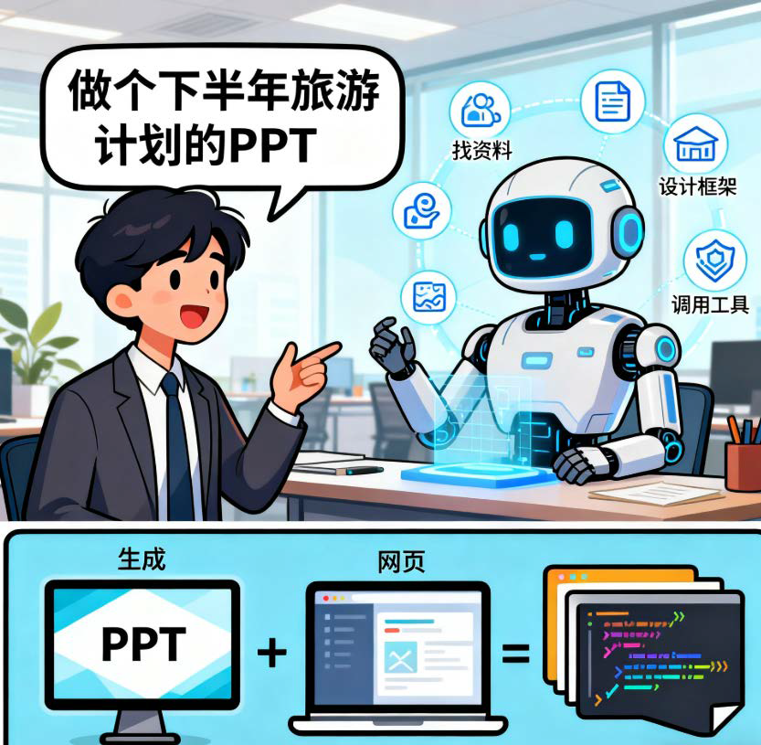 Coze空间是字节跳动做的一个 “AI同事办公室”。在这个“办公室”里,你不用下复杂的命令,就像跟真人同事说话一样,直接告诉AI你的需求就行。比如你说“做个下半年旅游计划的PPT”,它就能自己琢磨步骤、去找资料、调用工具,然后把做好的PPT直接交给你。