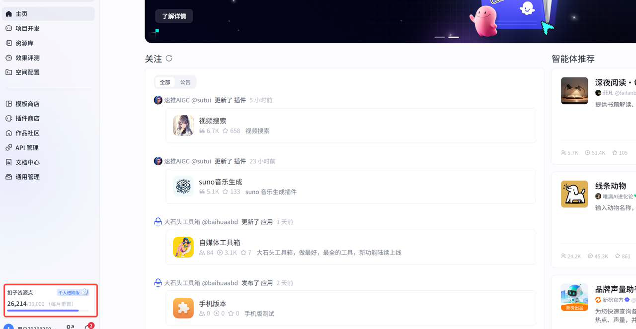 coze有免费额度,普通用户每次调用都是消耗资源点。普通用户每天有500个资源点,假如不够用